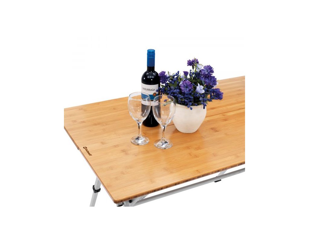 Stylový stůl s moderním designem. Vyrobeno z odolných materiálů, má odolnou bambusovou desku stolu a hliníkový rám. Montáž a demontáž během několika sekund. Praktická madla umožňují snadnou přepravu. Malá velikost balení. Nastavitelné nožičky.