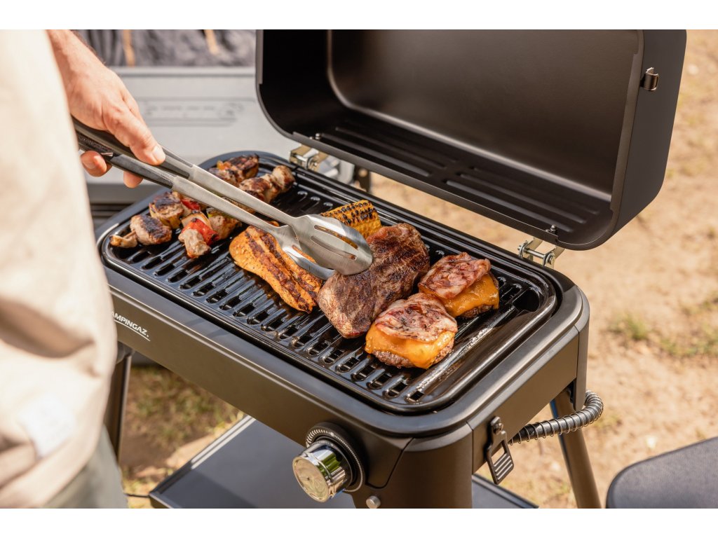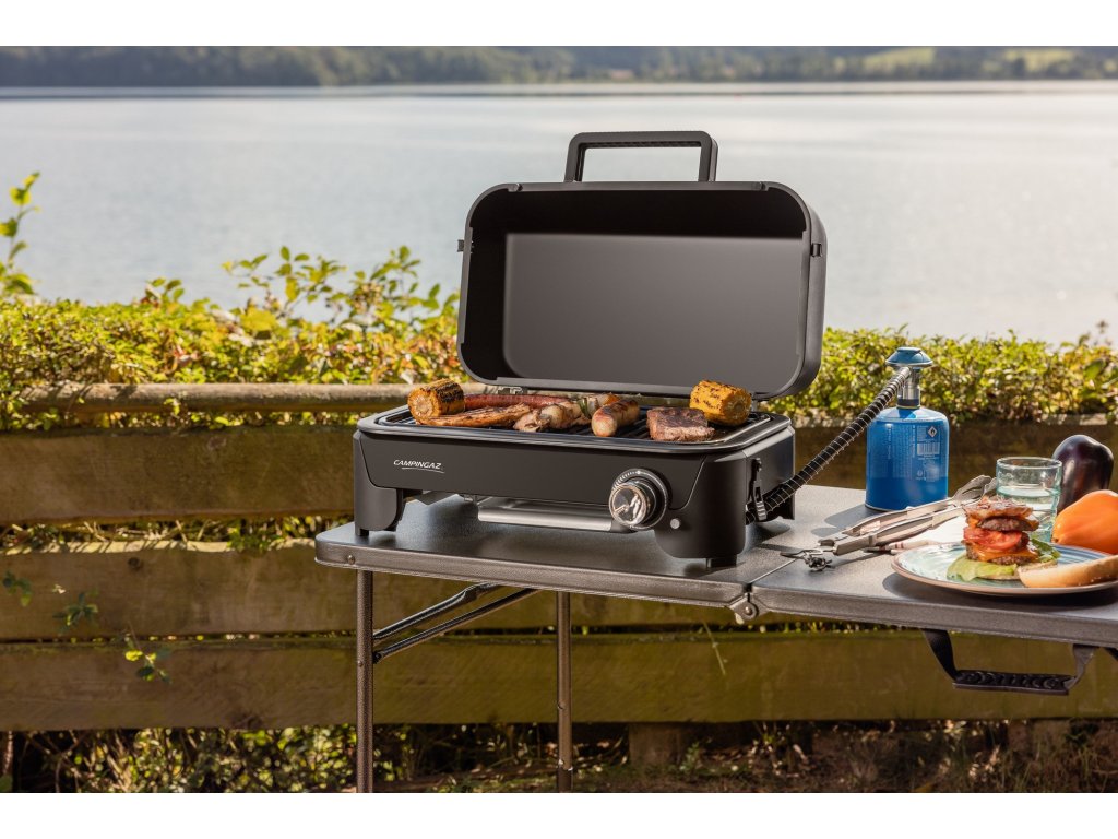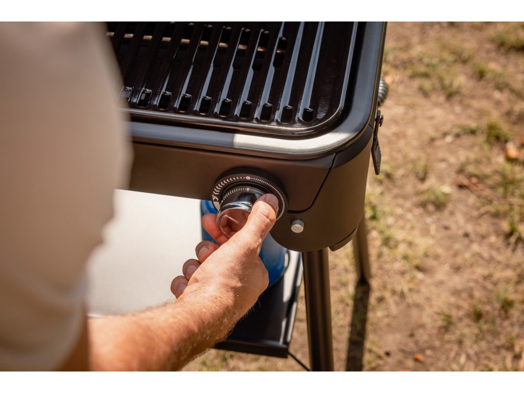 Nový lehký plynový gril na kartuši vhodný pro cestování, malé zahrádky i balkony. Čtyři ocelové nohy, které se dají demontovat a rozložit pro snadné skladování. Tělo grilu lze od nich jednoduše odpojit a gril tak použít jako stolní gril. Hořák ve tvaru U efektivně rozptýlí teplotu po celé ploše a uspoří váš plyn. Ochrana hořáku je zabudovaná přímo v roštu grilu. Vysouvací miska na nečistoty pro snadné čistění. Piezo zapalování. Držák plynové kartuše zabudovaný v poličce. 3 možnosti nastavení výšky grilu (bez nožiček samostatně, v poloviční výšce nebo s celými nohami a poličkou). Ocelová polička umístěna mezi nohami grilu. Klipy pro zajištění víka. Připojovací sada je součástí grilu.