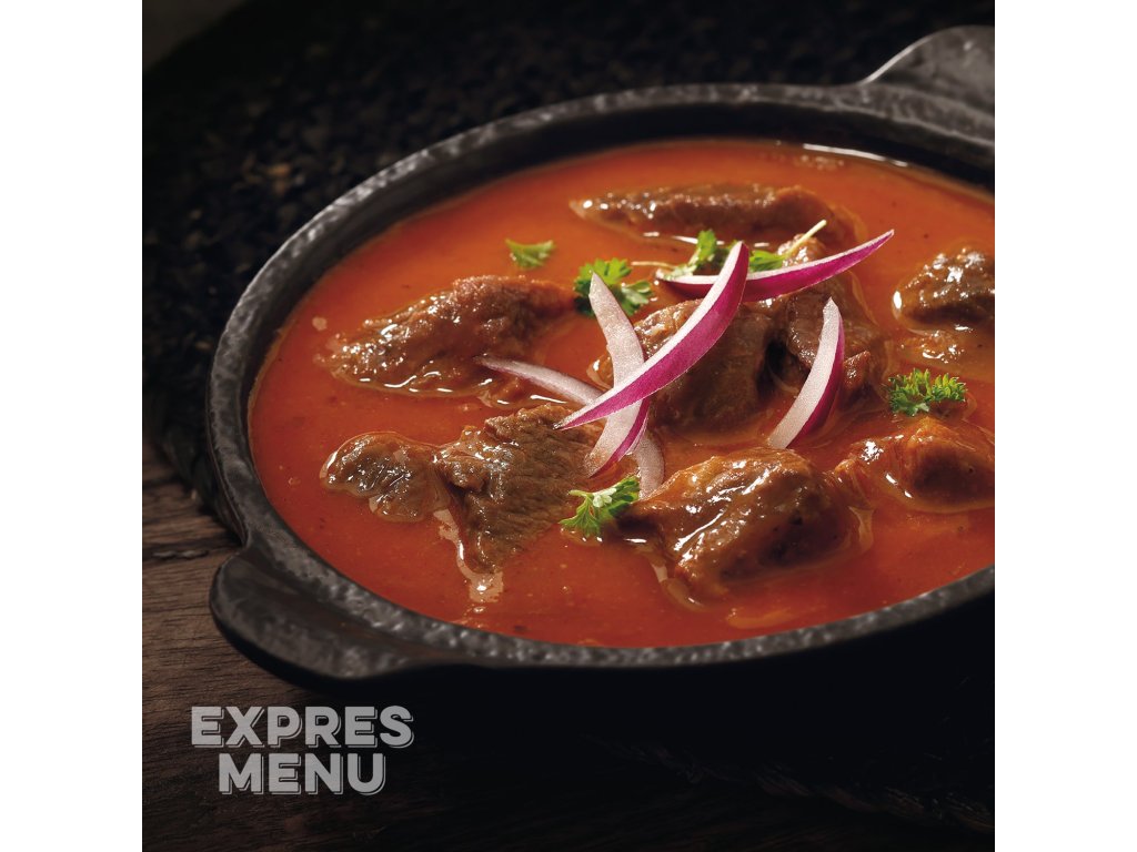 Libové kousky hovězího masa dušené doměkka v omáčce na cibulovém základu se sladkou paprikou, podlité taženým vývarem, dochucené česnekem a majoránkou.