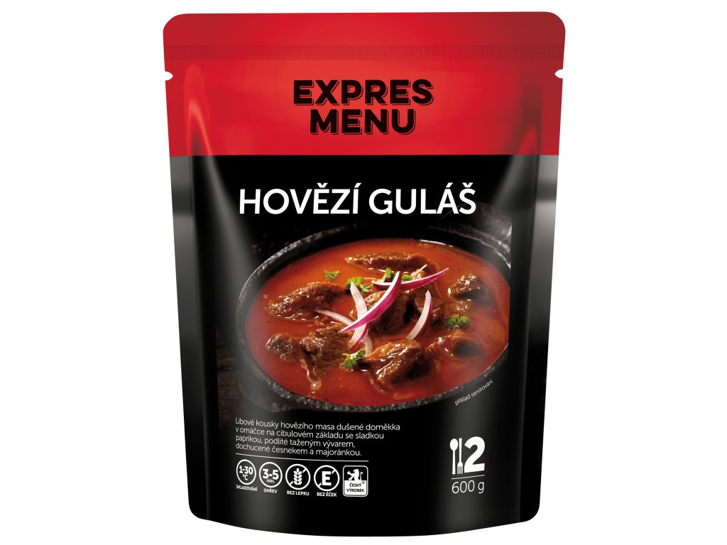 hovězí maso přední (31 %), hovězí vývar (voda, hovězí maso a kosti), cibule, rýžová mouka, česnek, kukuřičná mouka, řepkový olej, rajčatový protlak (voda, rajčatový protlak, sůl), paprika mletá, sůl kamenná, majoránka, kmín, pepř.