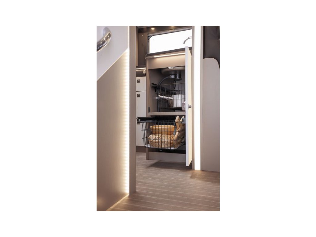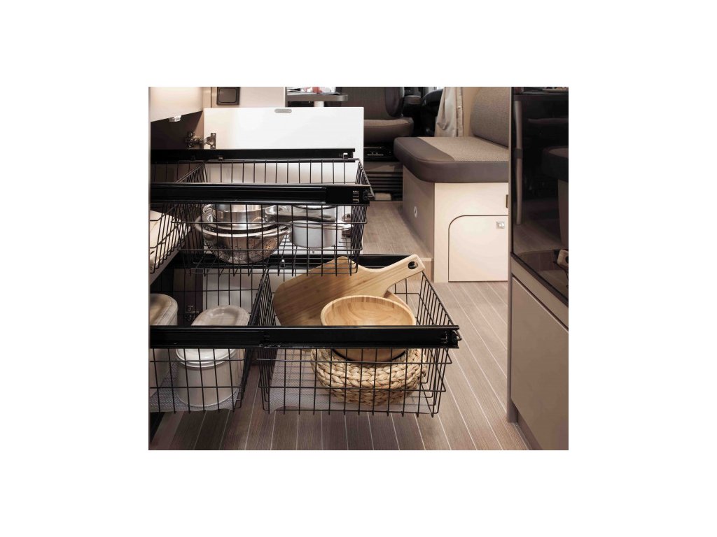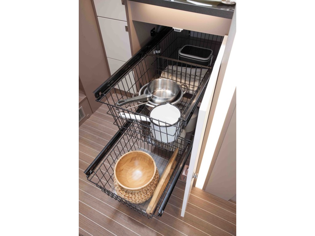 Praktické košíky lze ze systému snadno vyjmout, a proto se skvěle hodí, když jdete nakupovat na cestách nebo když nakládáte Etrusco. Chytrá sada váží pouhých 4,5 kg a kolejnice jsou vybaveny pohodlnými mechanismy měkkého zavírání. Odpadkový koš v kuchyňské skříňce lze také bez problémů nadále používat. V závislosti na modelu existuje možnost osadit druhou sadu, která vám poskytne až 4 koše.