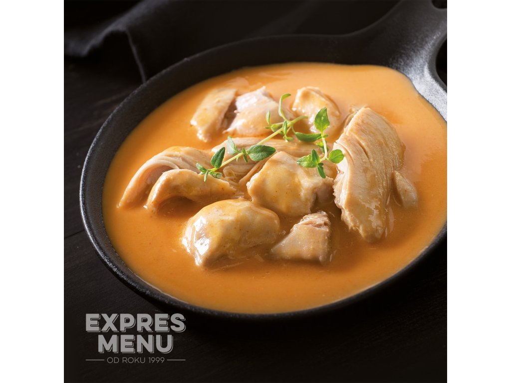 Šťavnaté kousky masa z kuřecích stehen, dušené doměkka v omáčce na cibulovém základu se sladkou paprikou. Omáčka je zjemněná smetanou.