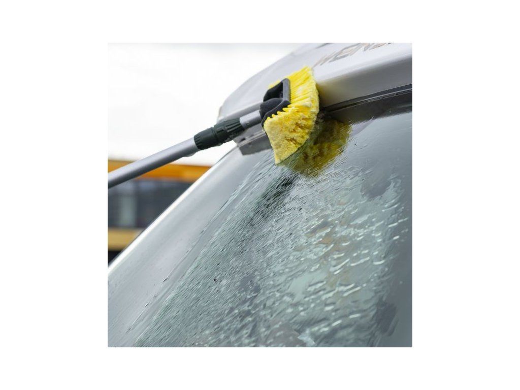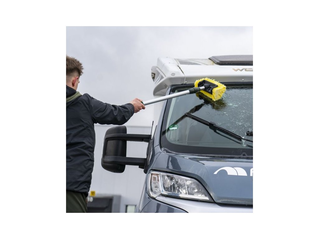 Nyní se snadno dostanete do každého rohu vašeho karavanu nebo obytného vozu. Hlava mycího kartáče je nově vybavena také super měkkými štětinami po stranách pro šetrné a důkladné čištění. Vyztužená, teleskopická hliníková trubka zaujme svou stabilitou, kovovou přípojkou pro mycí kartáč a zesílenou rukojetí. Kromě toho má rukojeť 19 mm hadicovou přípojku (kompatibilní se zahradou) a praktický vypínač.