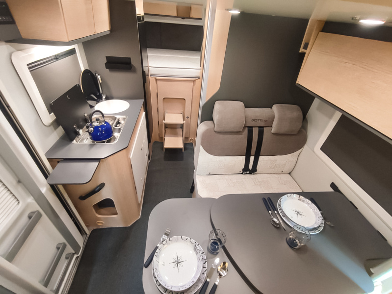 S délkou pouhých 5,99 metru nabízí Giottiline chytře navržený půdorys s příčným dvoulůžkem v zadní části, kompaktní a funkční koupelnu i praktickou a světlou obývací zónu. Zadní garáž přístupná z obou stran, nabízí překvapivý nákladový prostor pro obytný vůz této velikosti.