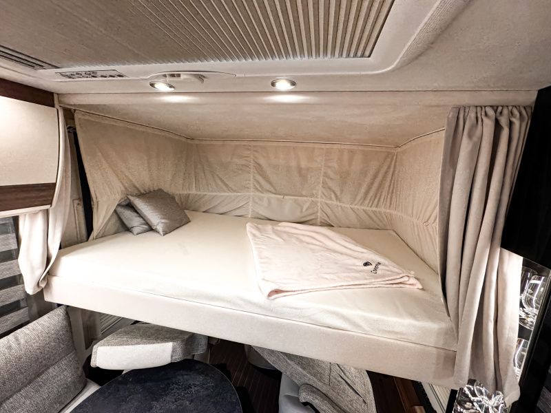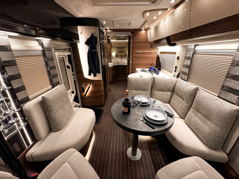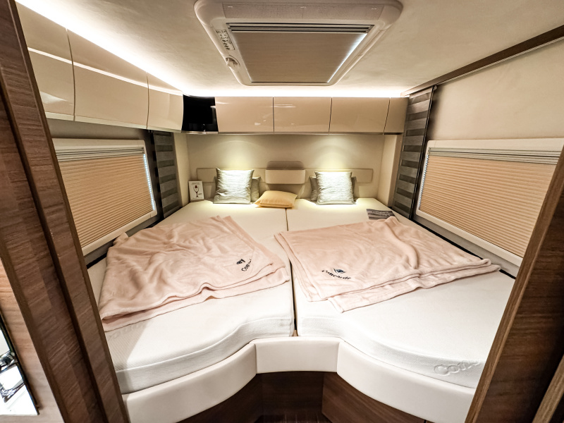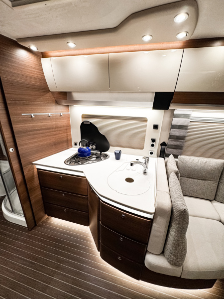 Concorde Credo je synonymem luxusu a precizního zpracování. Dvojitá podlaha s úložným prostorem o výšce 47 cm poskytuje dostatek místa pro veškeré vybavení, které chcete mít na cestách po ruce. O příjemnou teplotu v každém ročním období se stará teplovodní topení Alde o výkonu 5,5 kW, kombinující napájení na 230 V i plyn, a díky izolované kabině i bočním oknům si můžete dopřát komfortní cestování po celý rok. Interiér vozu zaujme na první pohled – luxusní design Jattoba Brilliant & Sanosan doplňují potahy z vysoce kvalitního mikrovlákna, které umocňují dojem elegance a útulnosti. Pohodlné CL-Lounge se čtyřmi místy k sezení i elektricky ovládaná roleta čelního okna