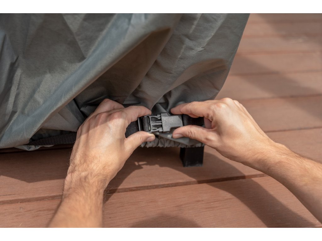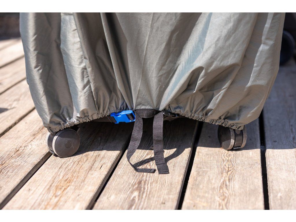 Ochranný obal šedé barvy s UV ochranou. Materiál: polyester 300D. Elastický pásek, který pevně drží obal na svém místě i při velkém větru. Čtyři boční nastavitelné spony, které umožňují lépe utáhnout potah pod kolečky grilu, napomáhají také lepšímu vypnutí obalu na grilu.Doplňkové parametry