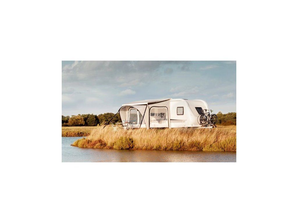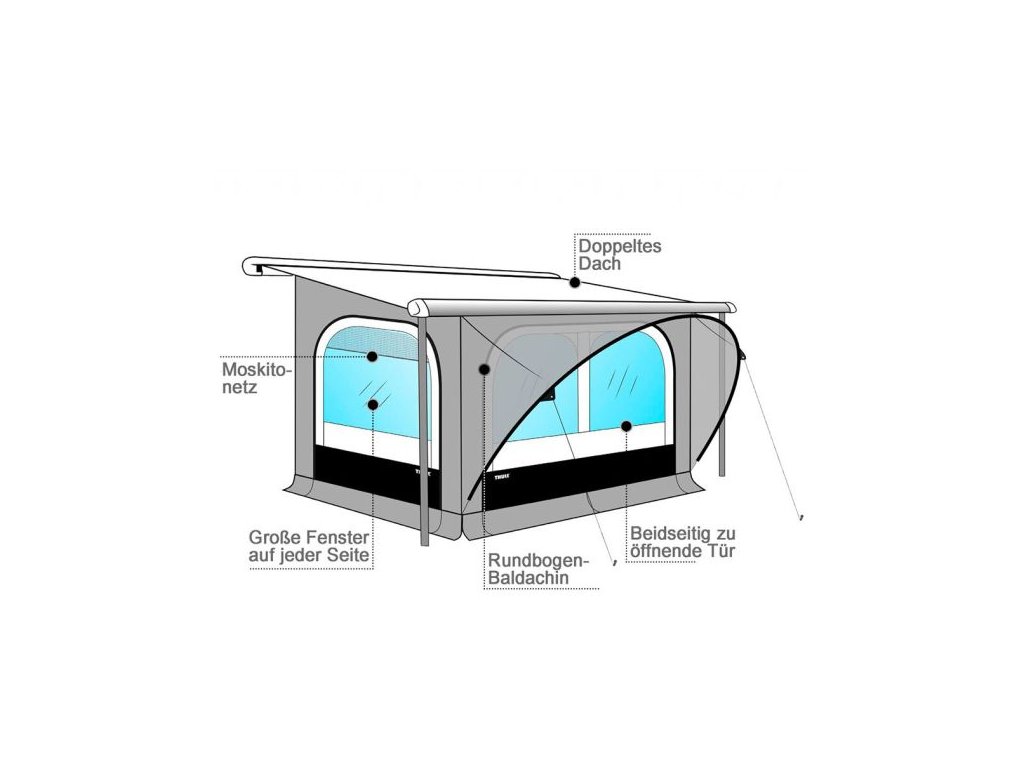 Lehký ochranný stan, který se díky patentované konstrukci velmi snadno a rychle postaví přímo pod markýzu. Celý stan je vyroben z jednoho kusu a nevyžaduje žádné další tyče. Pro montáž na střechu se používá buď stávající stanová kolejnice nebo volitelně dostupná montážní sada pro montáž na stěnu, je nutná volitelná montážní sada; Přední část je připevněna k potrubní liště markýzy. Thule QuickFit, který má elegantní, nadčasový design, ladí se všemi barvami markýzy a je vybaven integrovanými závěsy na všech oknech. Oblouková stříška, která je napnuta pomocí sklolaminátových tyčí, které lze rychle zasunout, poskytuje dodatečný stín nad velkými panoramatickými okny vpředu, která lze zcela otevřít. Boční okna jsou vybavena sítěmi proti hmyzu. Přístup je možný z přední i levé strany. Vzduchová vrstva vytvořená dvojitou střechou mezi markýzou a stanem poskytuje dobrou izolaci, aby byl stan chladný. Vyrobeno z odolného ripstop polyesteru, lehké, voděodolné tkaniny vyrobené z materiálu odolného proti roztržení používaného v letectví. Dodávka kompletní s podlahovou zástěrou, napínacím materiálem a taškou.