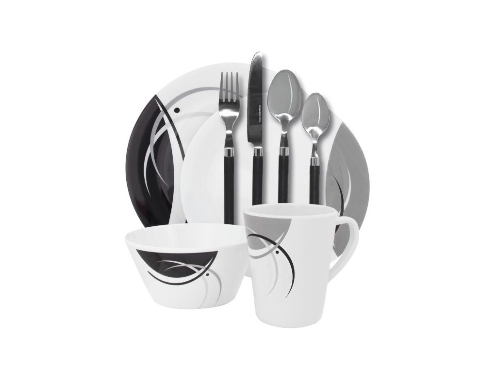 Sada nádobí se sadou příborů pro 2 osoby je ideální pro použití v obytném voze nebo stanu.