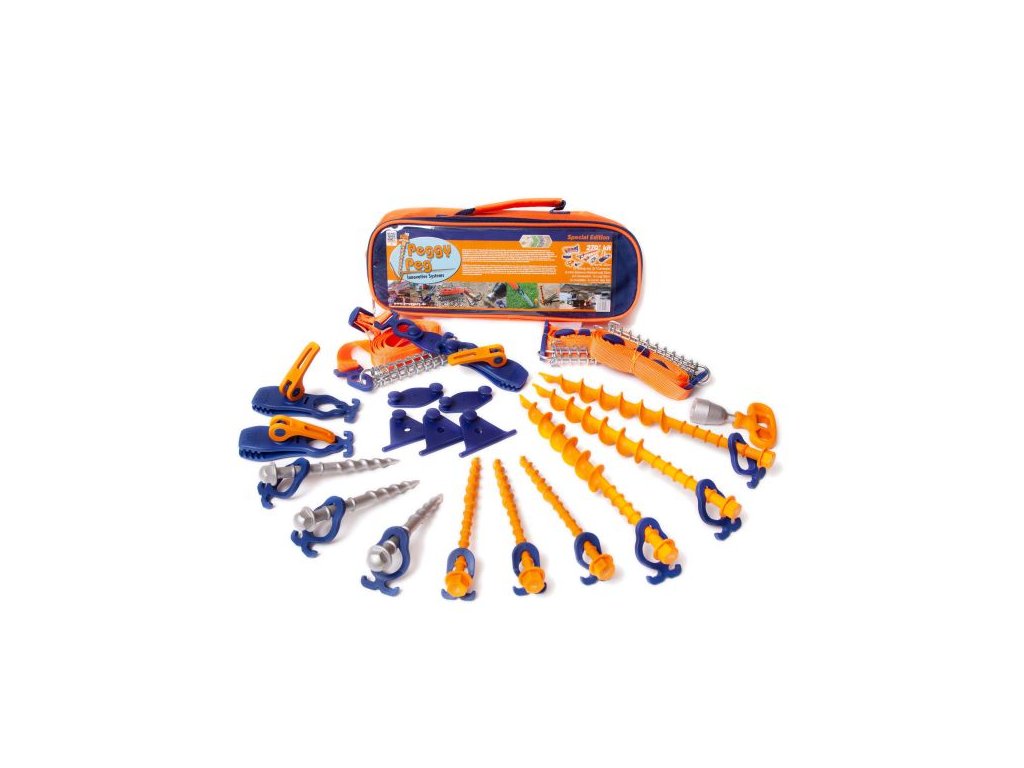 Navíc zajistěte svou 270° markýzu ve větru pomocí této chytré kombinace napínacích pásů a šroubových kolíků pro přišroubování pomocí akumulátorového šroubováku nebo ručního klíče. Vhodné pro 270° markýzy, stany atd. Ideální pro normální, měkké a písčité půdy díky přítlačnému závitu. PP šroubovací kolík (hliník) umožňuje upevnit markýzu i na extrémně tvrdém kamenitém podkladu. Pouze toto se zatluče a později vyšroubuje. Výškově nastavitelný hák u všech Peggy také umožňuje jejich použití na nejrůznějších podlahových podmínkách, např. B. Šroubové kolíky nezasahují úplně do země – ať jste kdekoli, bez ohledu na roční období (předvrtání může pomoci, zvláště v zimě). Veškeré náčiní je uloženo v kompaktním balení.
